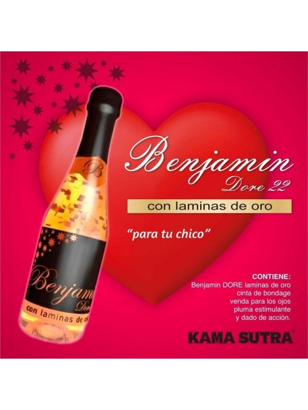 ESTUCHE con un BENJAMIN DORE CON LAMINAS DE ORO DE 22 KILATES de carácter afrutado, fresco y joven, compuesto por un vino espumoso muy selecto CON LAMINAS DE ORO de 22 KILATES PARA TU CHICO.