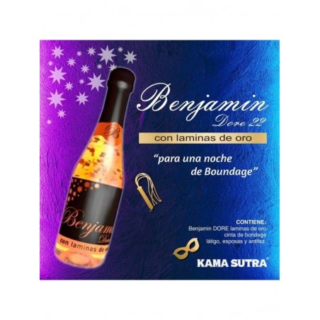 ESTUCHE con un BENJAMIN DORE CON LAMINAS DE ORO DE 22 KILATES de carácter afrutado, fresco y joven, compuesto por un vino espumoso muy selecto CON LAMINAS DE ORO de 22 KILATES PARA UNA NOCHE DE BDSM.