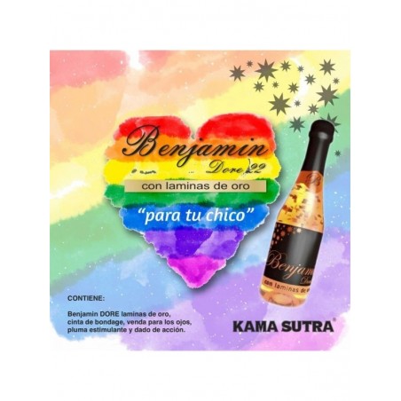 ESTUCHE con un BENJAMIN DORE CON LAMINAS DE ORO DE 22 KILATES de carácter afrutado, fresco y joven, compuesto por un vino espumoso muy selecto CON LAMINAS DE ORO de 22 KILATES PARA TU CHICO CON BANDERA ARCOIRIS, ORGULLO LGTB.