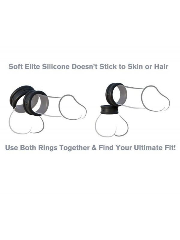 Set de dos anillos con diferentes medidas para que lo utilices en el pene y los testículos. Están fabricados en Silicona Elite muy comfortable de color negro y tienen un grosor de un centímetro aprox, algo ideal para utilizarlo en largas sesiones de sexo. Los dos tienen diferentes diámetros, así podrás encontrar el tamaño exacto o podrás utilizar varios al unísono.