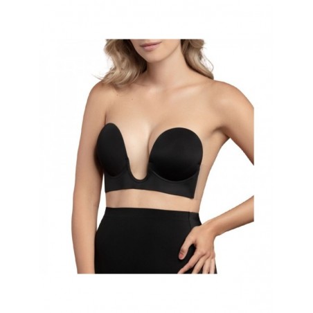 El sujetador de estilo U ofrece una solución impecable para un corte bajo o escotada.  El sujetador de estilo U levanta y realza los pechos para esos escotes profundos. El soporte adhesivo adicional en la base del sujetador está diseñado para aumentar la comodidad y la fiabilidad