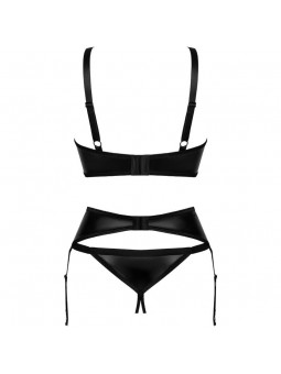 ¿Quiere crear un ambiente especial? ¿Quieres impresionar con tu estilo en los momentos compartidos? Causa una impresión deslumbrante con el conjunto de tres piezas de la colección Armares, que incluye un sujetador con tentadores recortes, un seductor liguero y un tanga de intrigante diseño. El material negro ligeramente brillante resaltará sutilmente tu belleza, mientras que su elasticidad te garantizará el máximo nivel de comodidad. No espere más y compruébelo usted misma