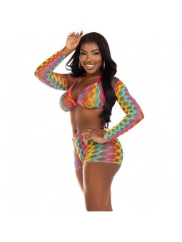 El conjunto de tres piezas de top con sujetador, bolero y pantalones cortos de malla en color arcoíris es una explosión de estilo y diversión. Diseñado para aquellas que desean destacar y expresar su personalidad vibrante, este conjunto es una declaración audaz de moda y originalidad.